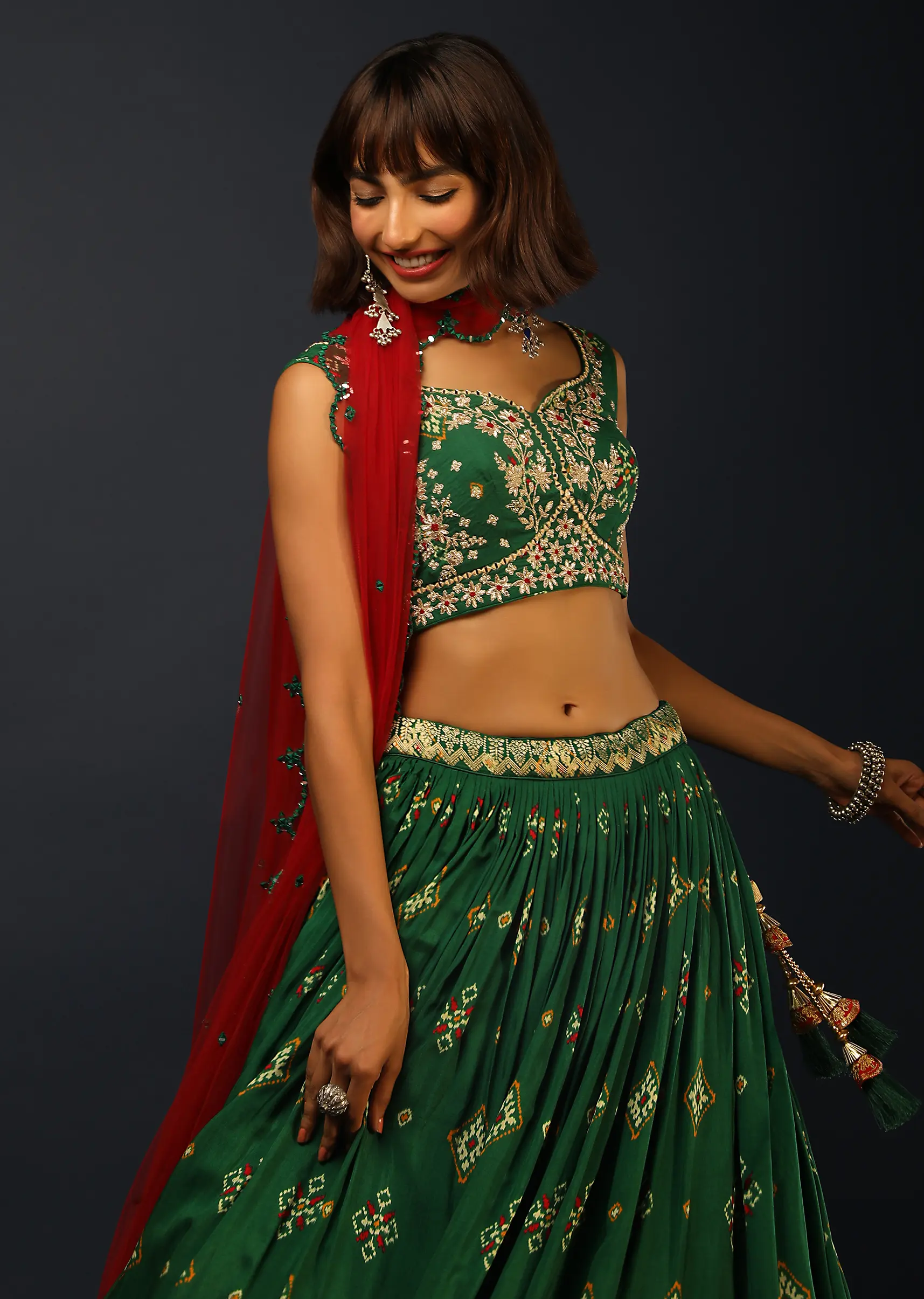 • Bottle green lehenga in silk with patola printed buttis and woven maroon border.