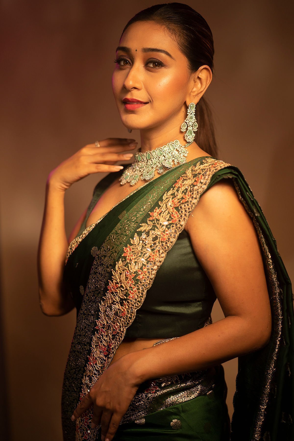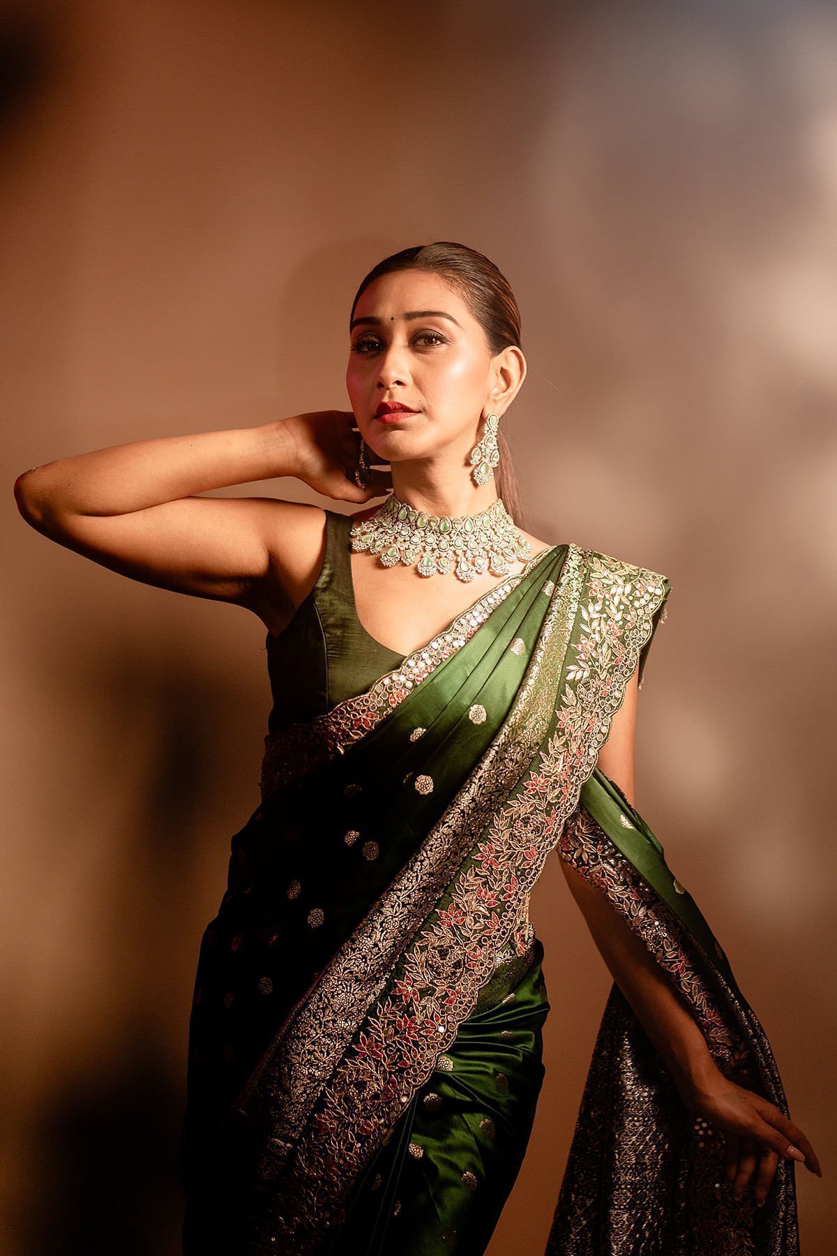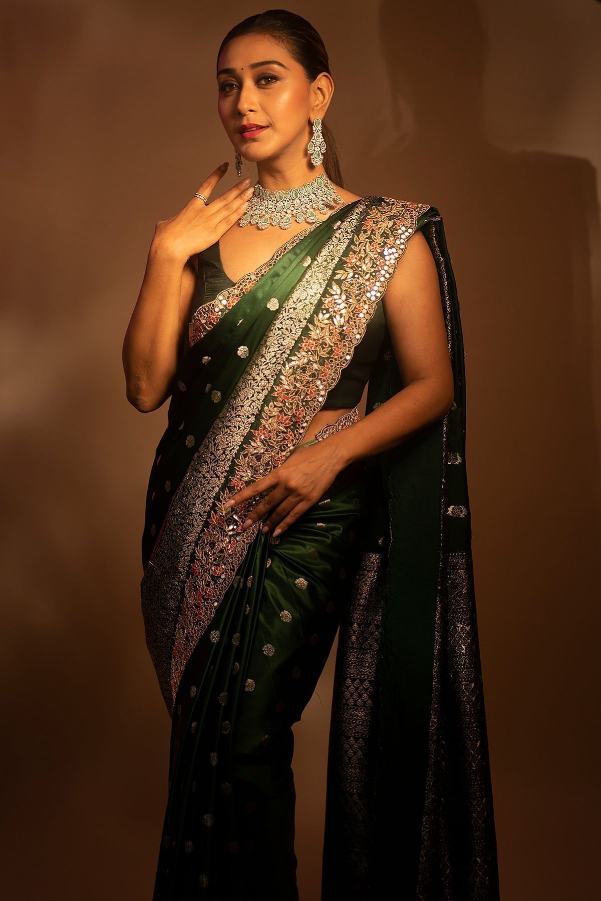 Ignite the spirit of celebration with this resplendent Satin Silk saree in a captivating Castleton Green. The saree body is adorned with zari woven floral buttis. The border and pallu, enriched with exquisite gold zari woven, zardosi, gota, dori, abla, cutdana & thread work creating a floral series, add a touch of opulence and allure. The unstitched blouse matching Castleton Green, accentuated with hand embroidery, is perfect for any celebrations and events. This saree radiates joy and excitement, making it the perfect choice for any special occasion. There might be a slight color variation in the image and original product due to photographic lighting sources or your monitor settings.