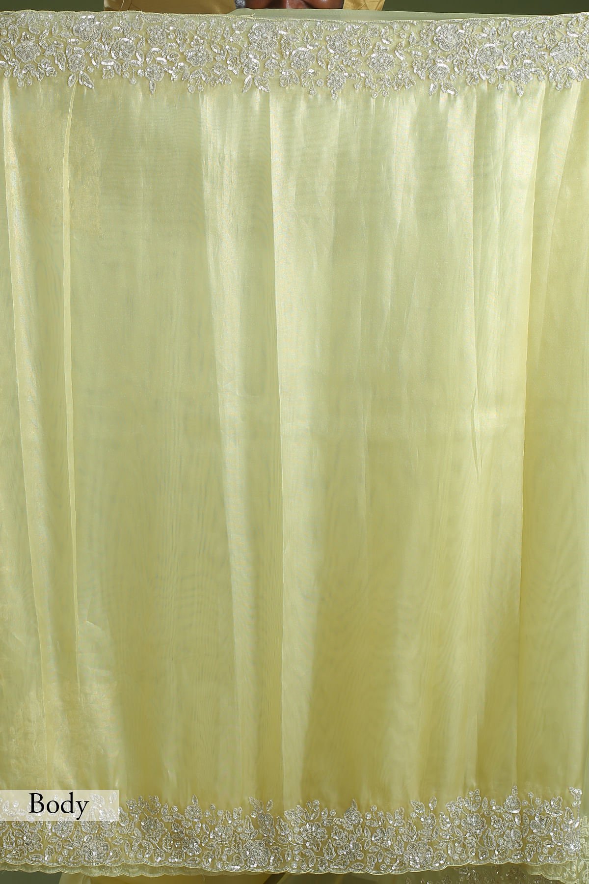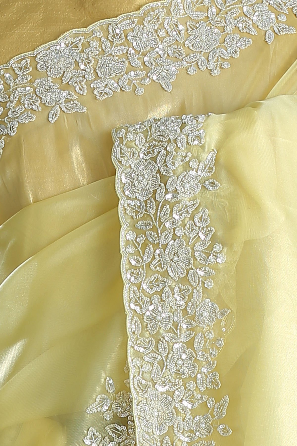 Saree Blouse Border : Gold Blouse Border Work : Sequins, Bead & Pearl Work Blouse Fabric : Tissue / 80 cm Blouse Length : 80 cm Blouse pattern : Unstitched Saree Blouse work : Sequins, Bead & Pearl Work Saree Blouse Color : Golden Mist Yellow
