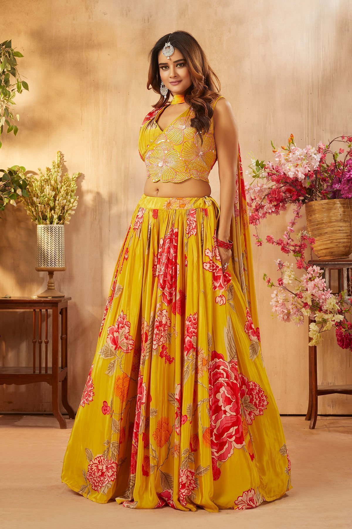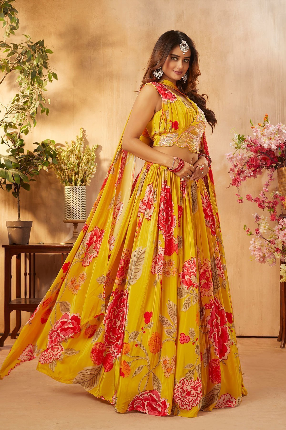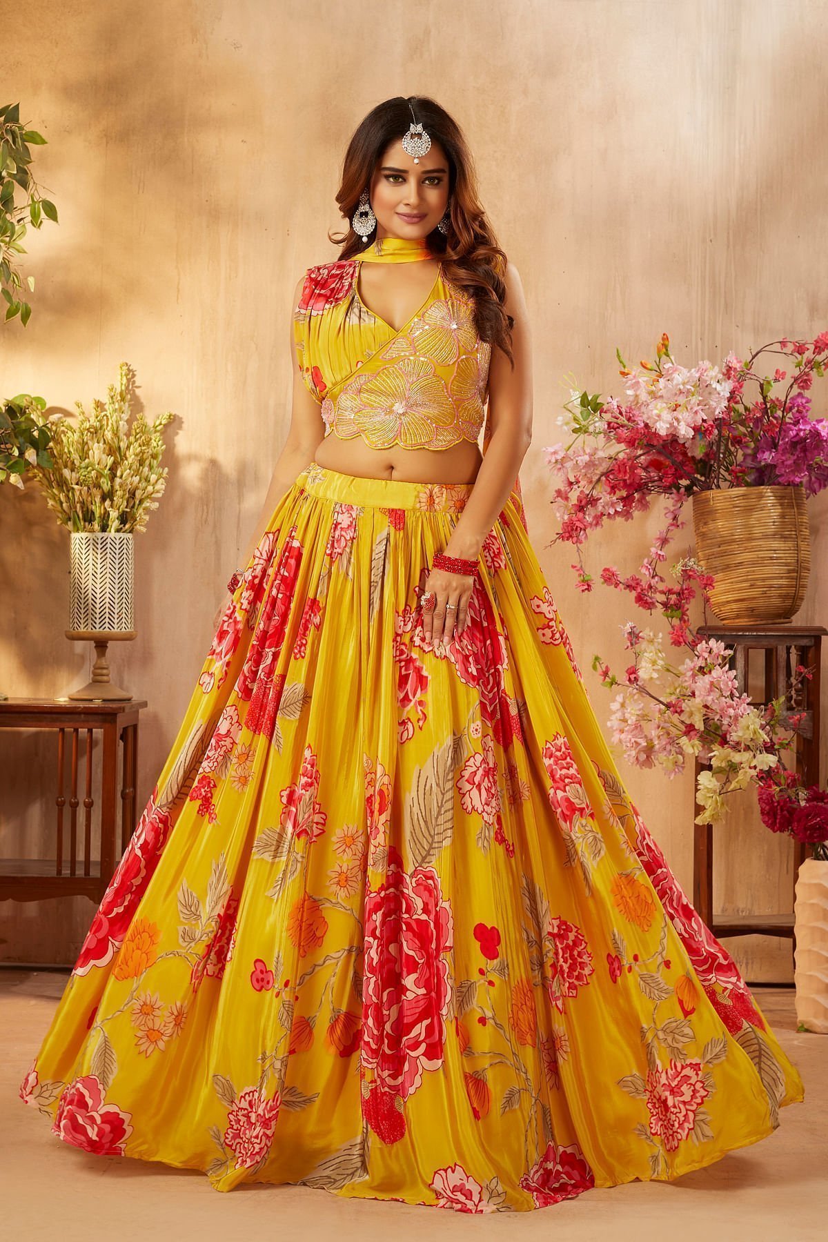 Lehenga Choli : Readymade Lehenga Choli Back Neck Pattern : Closed Neck Lehenga Choli Color : Golden Yellow Lehenga Choli Fabric : Crepe Lehenga Choli Front Neck Pattern : V-Neck Lehenga Choli Length : 38 cm Lehenga Choli Sleeves : Sleeveless Lehenga Choli Work : Printed, Cutdana, Sequins & Resham Work