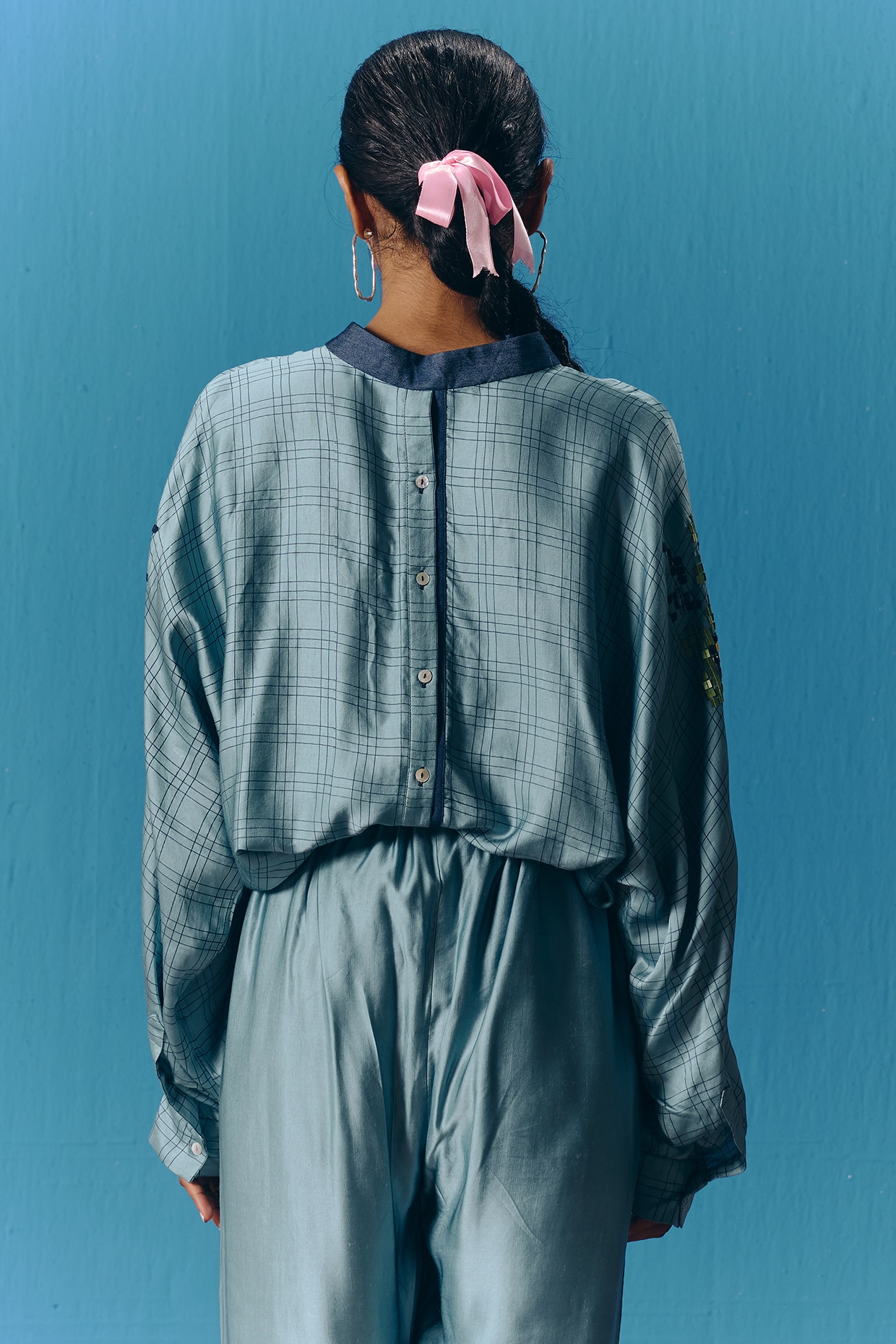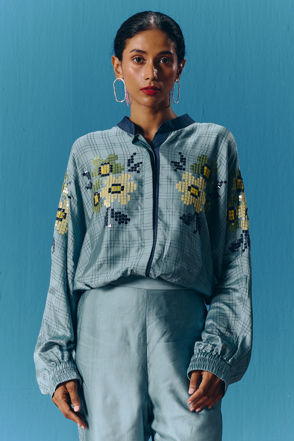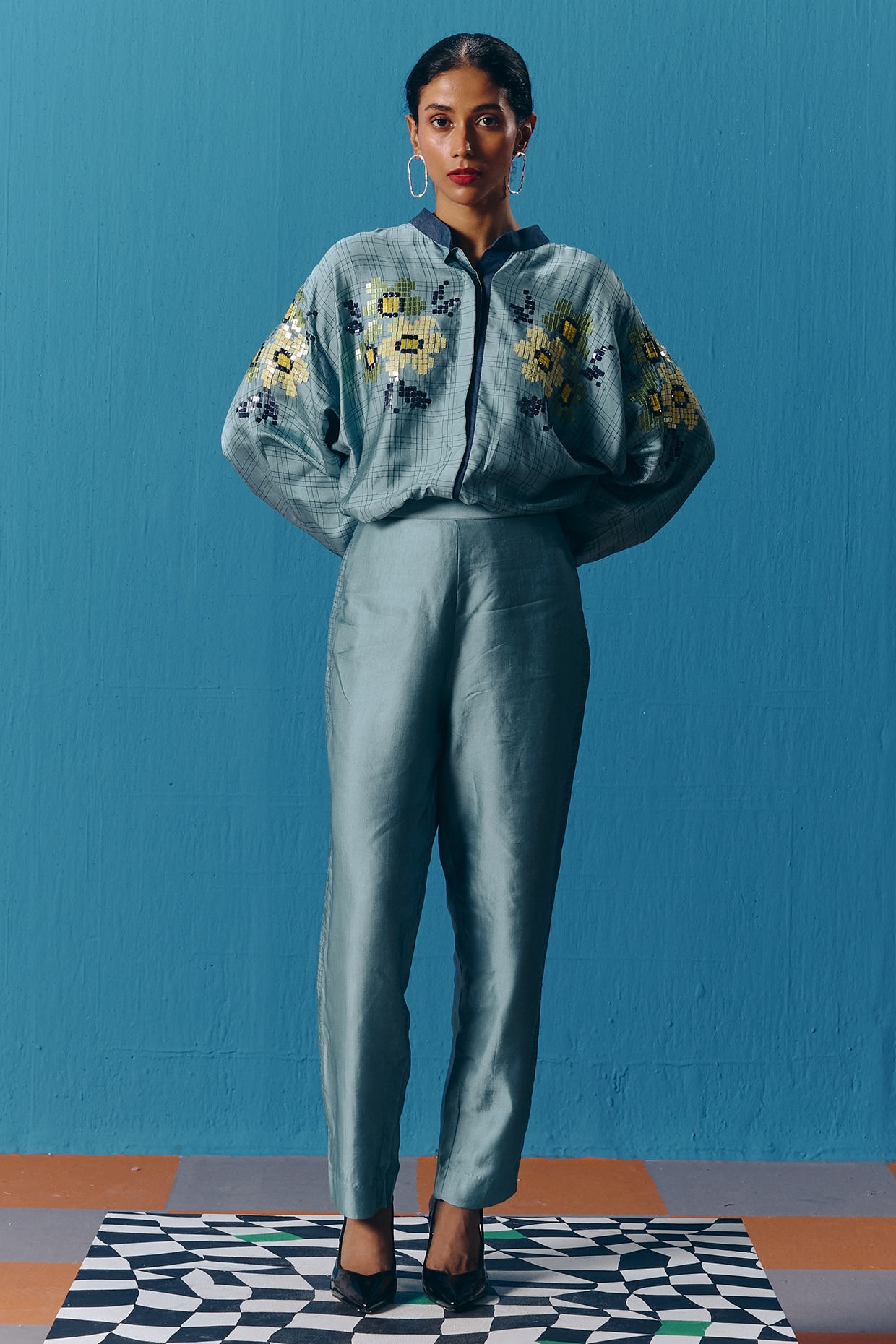 Featuring a sky blue kimono top in silk satin base with hand embroidery. Accentuate it with pants, statement earrings and heels for casual wear or a sundowner.